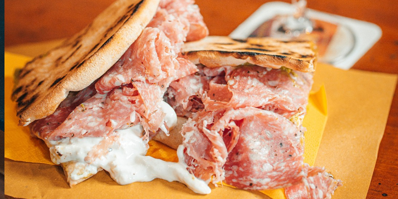 Schiacciata tostata e farcita con lonza di maiale, formaggio al pepe, pomodori semi secchi, basilico